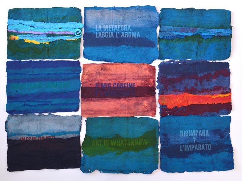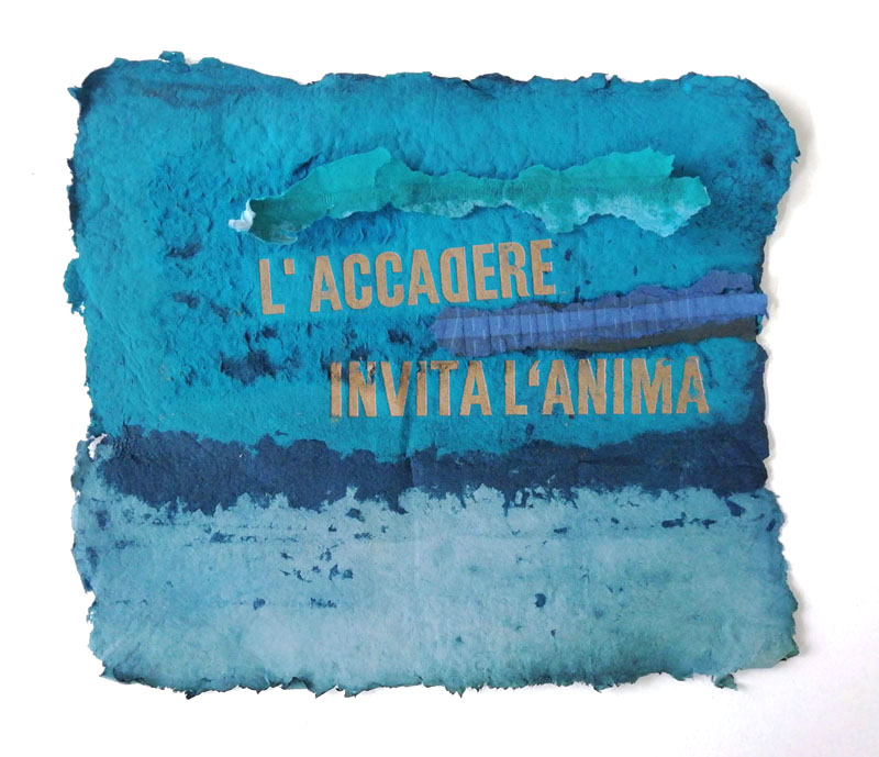 I looked at past work and notebooks, extracting significant words and phrases in a process of re-evaluation. I also worked on the project Accenda la luce, nasce l’ombra over the lockdown periods, a composite wall piece consisting of 72 sections with embossed and printed lettering using letterpress type and book binding press. Each standalone piece becomes part of the overall installation – a wall of fragments and random thoughts incorporating old sayings with scraps of personal nostalgic thought. The words are deliberately intended to have possible multiple meanings to reflect diverse responses to a common experience and to evoke an imagined future.