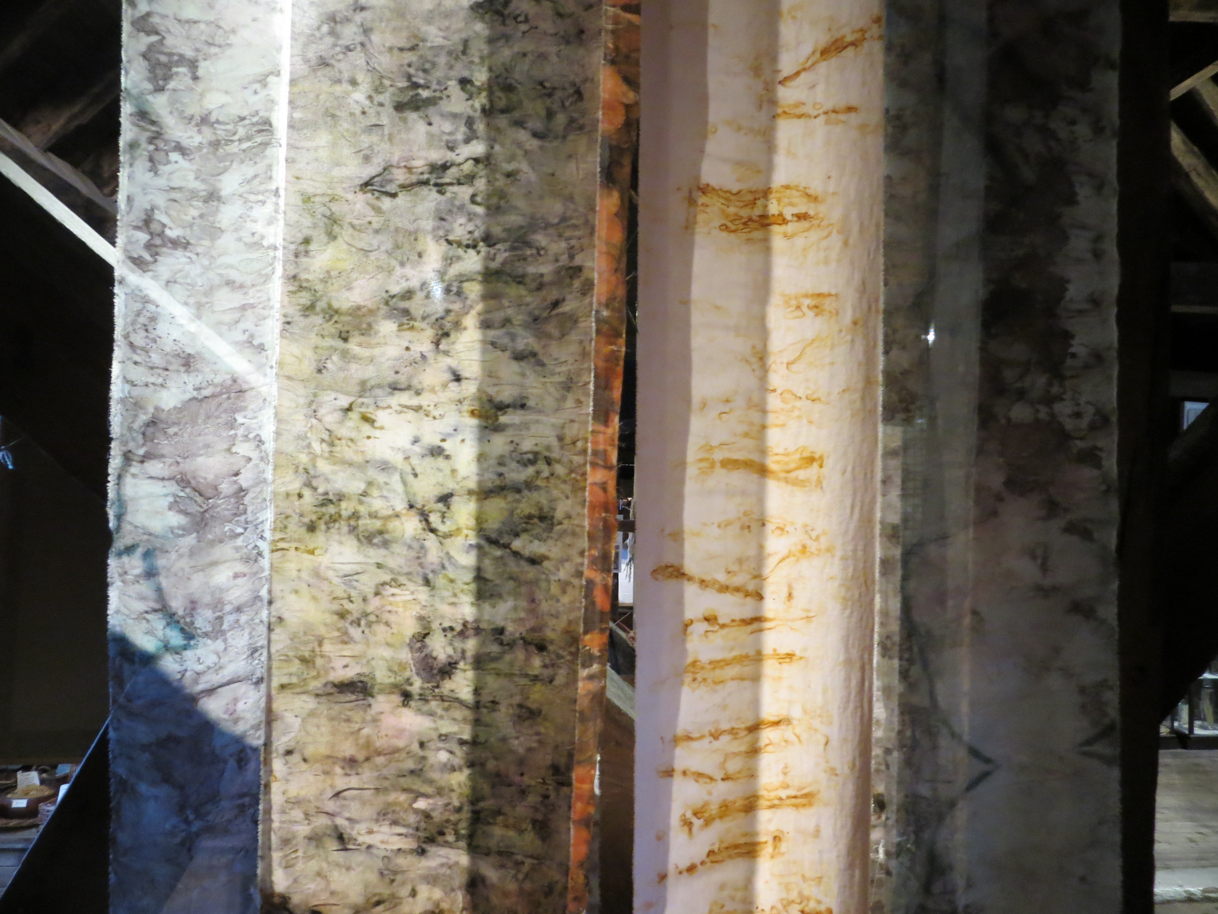 The project continues my exploration of environmental issues looking at material that finds its way into the Thames either through natural phenomena or human activity, and how this impacts on the health of the river’s ecosystem and its effect on the surrounding population. I’ve used debris recovered from the foreshore at various points along the river – plastic netting, nails, sand, silt, aged wood, charcoal, algae, bones – to create impressions using cyanography, chromatography and eco printing to represent both the visible and the invisible with particular reference to micro fibre plastic and pharmaceutical contamination.