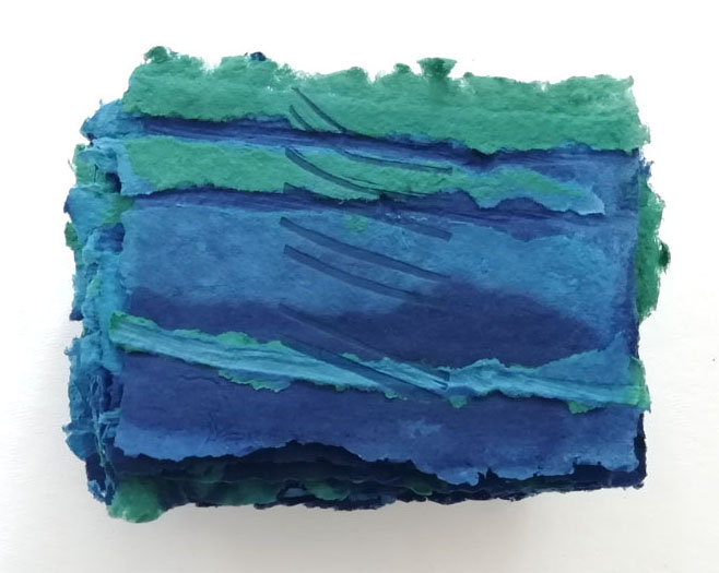 The furrows, created by stripping away embedded hollow paper strips from the pulp layers, depict water level marks indicative of wider changes. I included the intermittent imprint of knots in the paper to denote the interruption to the natural flow of water.