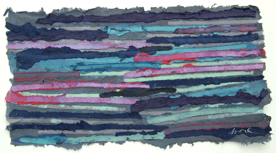 The work is created from pulped cotton fibres and pigment dyes. The process involves laying down layers of pulp, wet on wet, using mesh screens. The variation in thickness which gives the watermark effect is created using strips of paper cord of different widths which is pulled away when the pulp is still wet leaving some thin sections. The work was dried slowly in the open air to allow the dyes more time to react to the fibres to intensify the density of the colours.